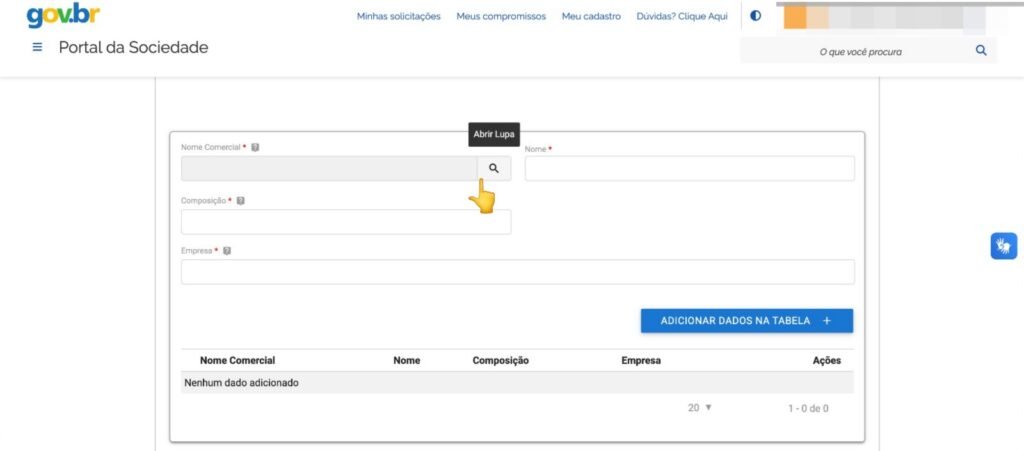 - Preencher com o Nome da Empresa: No campo apropriado, digite o nome da empresa fornecedora do medicamento, que deve ser cadastrada na Anvisa. Neste tutorial, estamos utilizando a empresa Hempgan como exemplo.