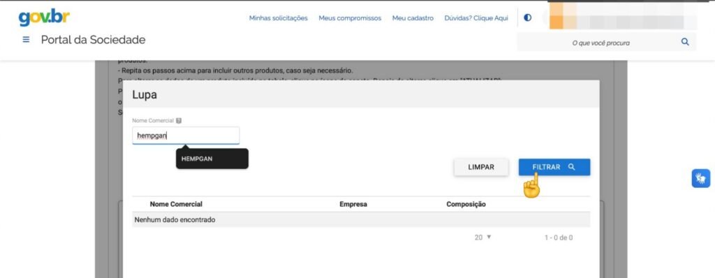 - Inserir o Nome Comercial: Digite o nome comercial do medicamento conforme consta em sua receita médica. Se você fez a consulta com o Instituto Bem Vida, insira o nome na lupa: HEMPGAN. É importante usar o nome exato para garantir que você esteja solicitando a autorização para o produto correto.