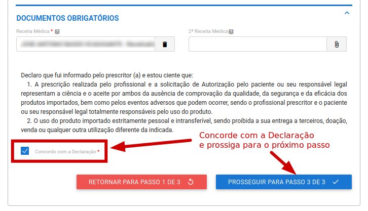 Neste estágio do processo, você será solicitado a ler e aceitar uma declaração relacionada aos produtos à base de canabidiol que deseja importar. Este é um passo legal importante para garantir que você compreende as responsabilidades e regulamentos associados ao uso desses produtos.