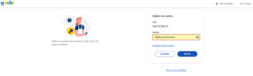 Após clicar em “Iniciar”, será necessário fazer login para prosseguir. Insira sua senha no campo indicado e clique em “Entrar”. Esta senha é a mesma utilizada para acessar diversos serviços do governo.