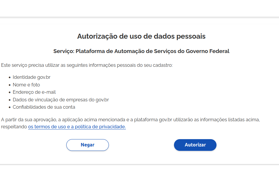 Clique em “Autorizar” para permitir que o sistema acesse e utilize esses dados. Isso simplifica o processo, eliminando a necessidade de inserir novamente informações que já estão registradas no sistema governamental.