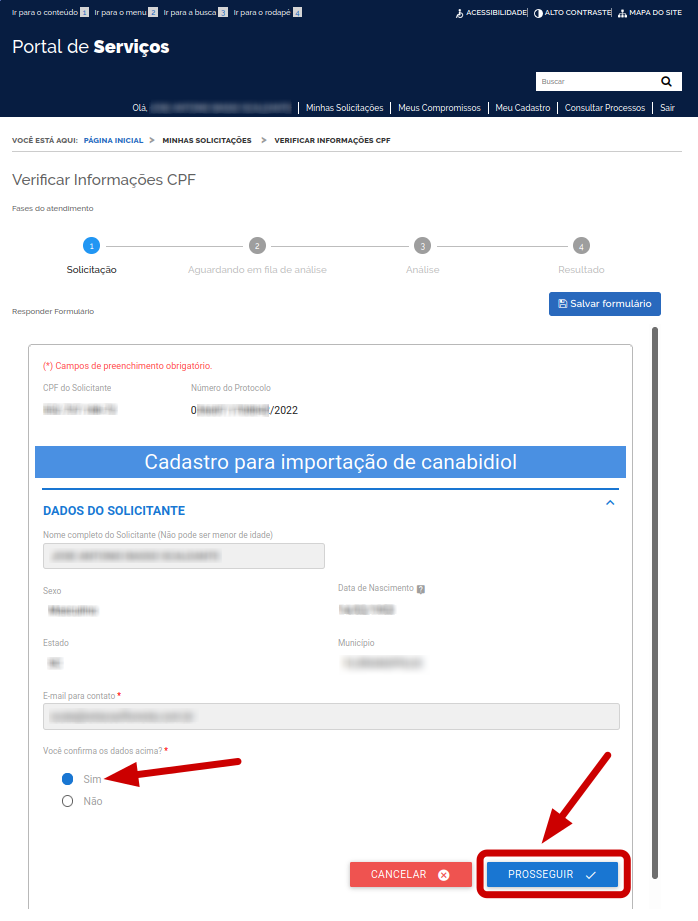 Uma vez que tudo esteja conferido e correto, clique em “Prosseguir” para dar continuidade ao processo de solicitação da autorização de importação de produtos à base de canabidiol.