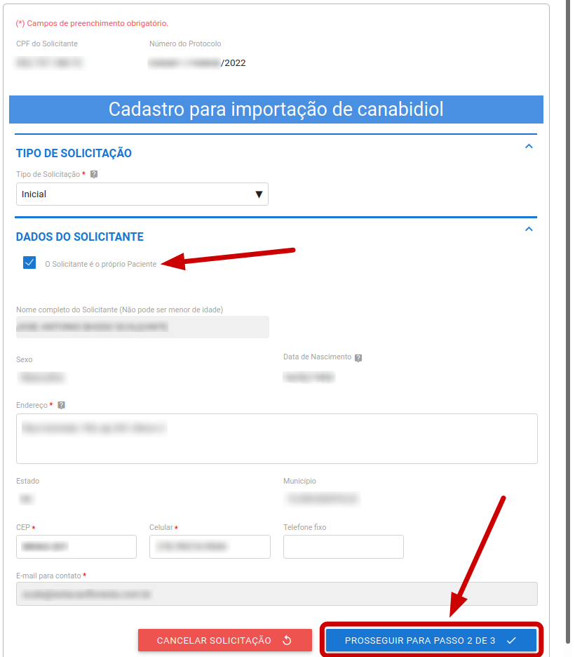 Esta etapa é essencial para garantir que a autorização seja processada corretamente, associando a permissão de uso do produto à pessoa correta, seja o paciente direto ou seu representante legal.