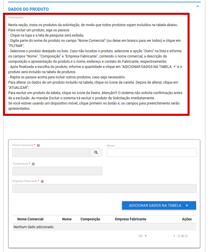 - Leitura Cuidadosa: Certifique-se de entender todas as instruções disponíveis, pois elas irão guiar você sobre como especificar corretamente o produto, incluindo detalhes como concentração, forma farmacêutica, e quantidade.